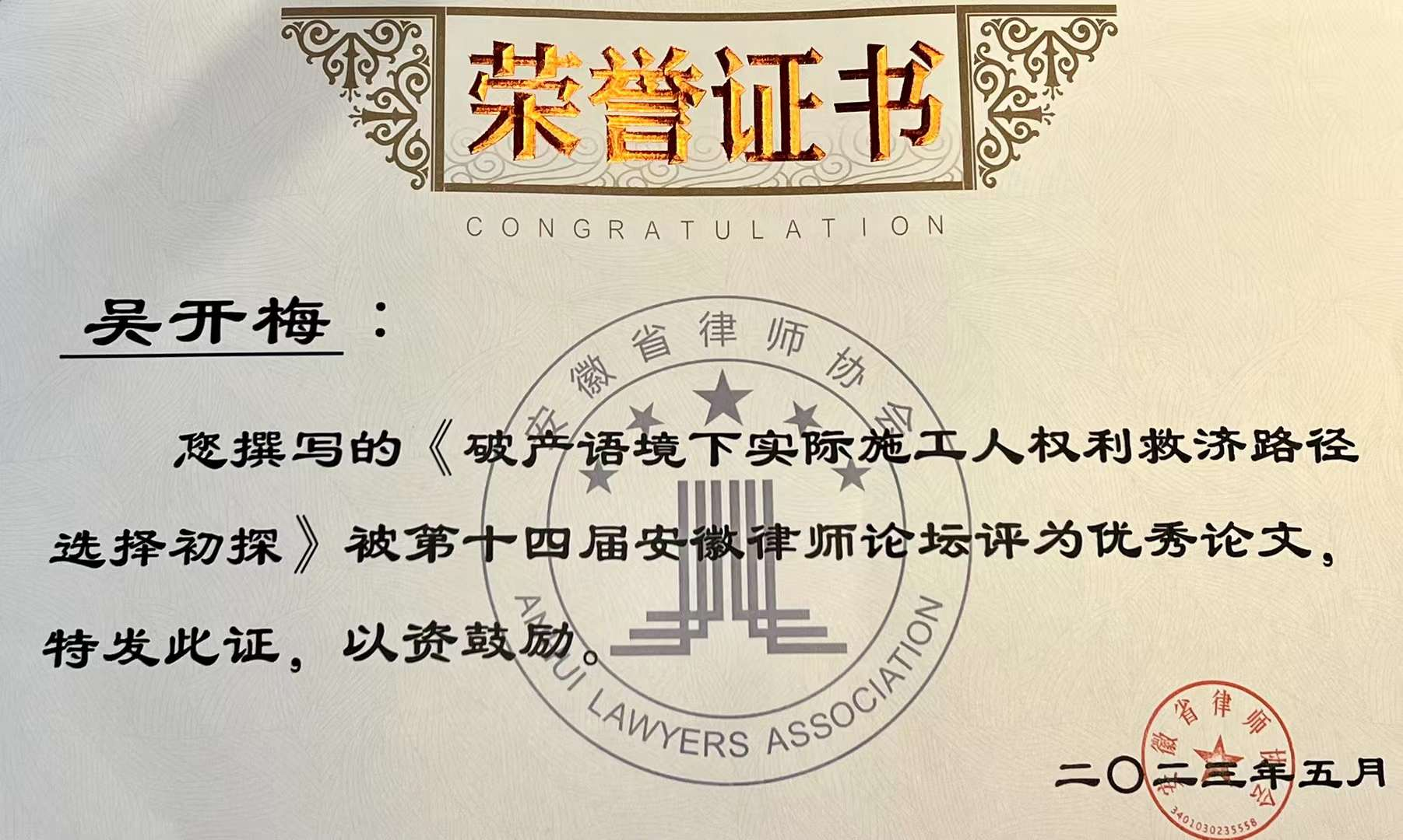 安庆律师共七篇论文入选,五位律师受邀参加论坛交流,安徽中皖律师事务所主任陈文龙就律所规范化建设作经验交流,安徽中皖律师事务所刘婧婧律师的论文《商事审判的人工智能新路径》、安徽安联律师事务所吴开梅律师的论文《破产语境下实际施工人权利救济途径选择初探》被论坛评选为优秀论文,充分展示了安庆律师在司法实务领域与学术理论领域的扎实功底。