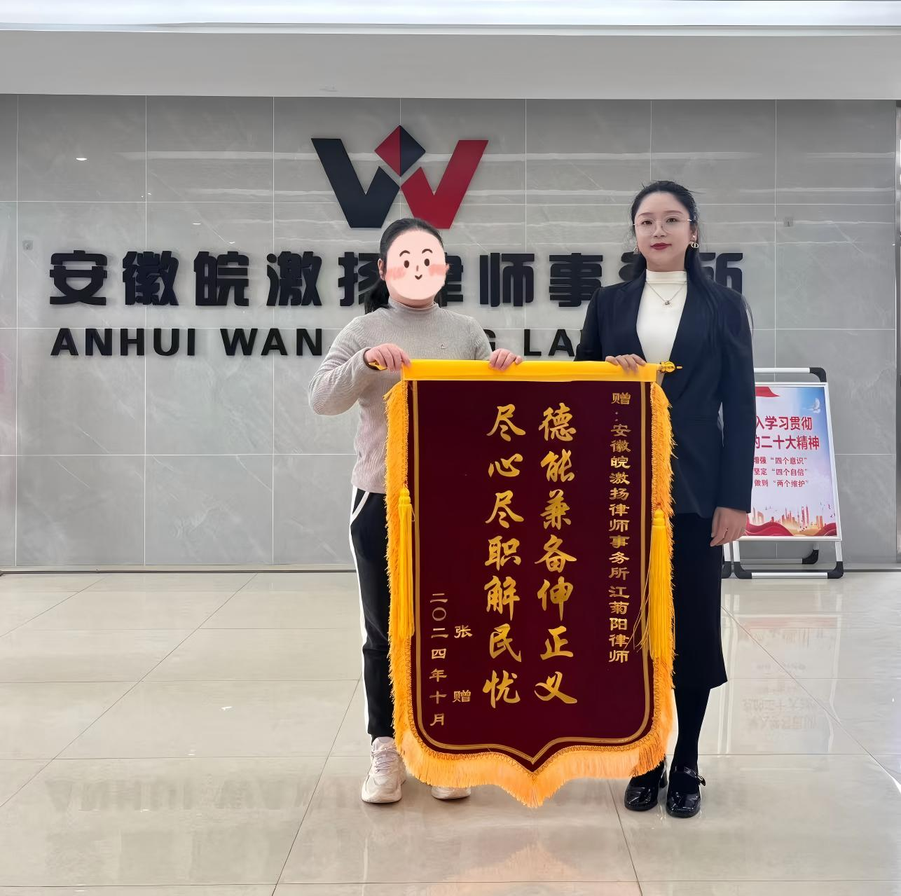 在法律维权的征程中,总有一些瞬间闪耀着温暖与力量的光芒。安徽皖激扬律师事务所江菊阳律师接连收到两位当事人为两起案件送来的锦旗。锦旗上“德能兼备伸正义,尽心尽职解民忧”与“为民解忧办实事,热情服务暖人心”的烫金大字,字字饱含感激之情,不仅是当事人对江律师专业能力的由衷认可,也是对皖激扬律师事务所践行社会责任、传递法治温度的生动诠释。