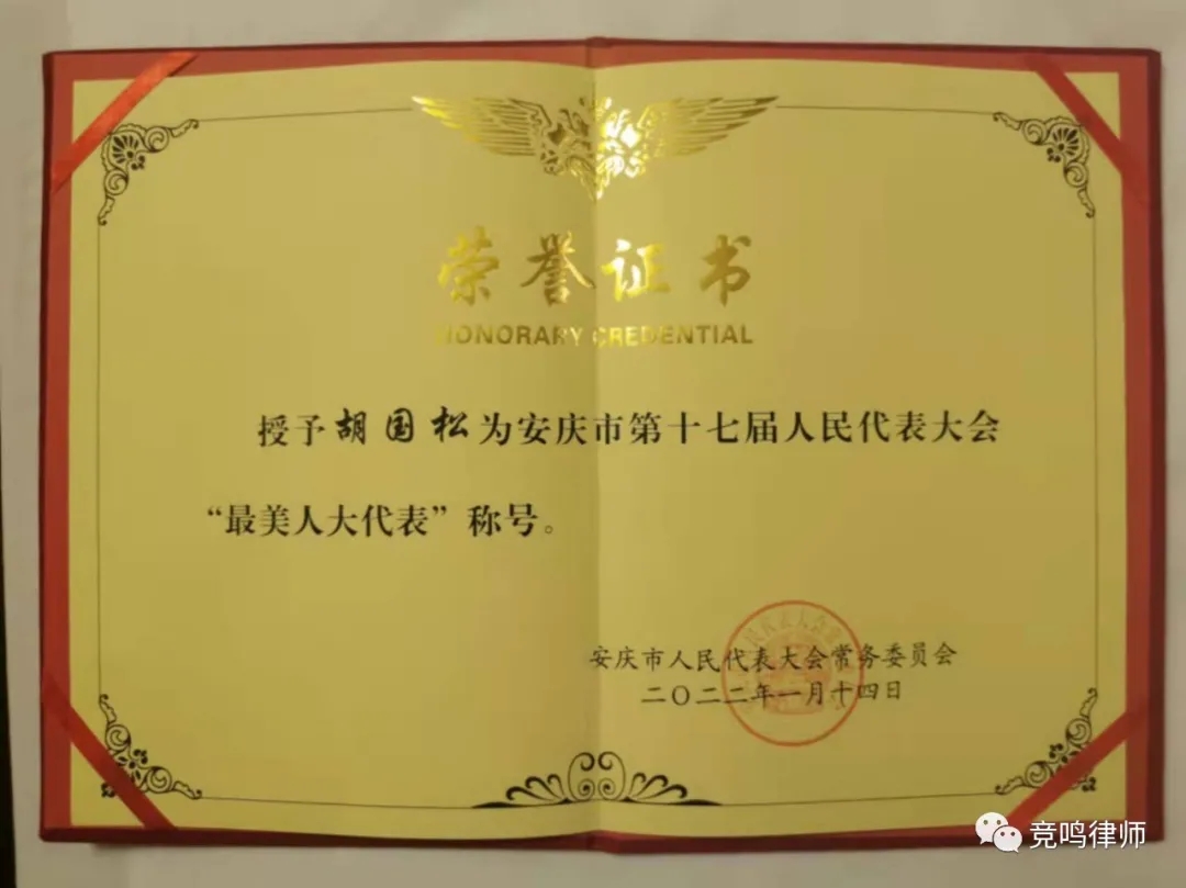 胡国松律师系安庆市第十七届人民代表大会代表,他注重党性修养,忠诚于律师事业,每年担任我县党政机关、人民团体、企事业单位常年法律顾问20余家,利用其精湛的法律知识和丰富的实践经验,提供优质的法律服务,受到高度评价与充分肯定;他注重勤奋学习,保持人大代表的先进性,多次到北京大学“政府法律顾问研修班”、华东政法大学、西南政法等名校进行研修与深造,成功推动《安庆市花亭湖风景名胜区管理条例》获得通过与报备并于2019年12月1日实施。他所在的竞鸣律师事务所被确立为安庆市人大常委会立法联系点,他本人被县人大常务委员会任命为司法与监察委员会委员,被市人大常务委员会聘为“市人大立法专家咨询员”;他注重密切联系人民群众,积极担当作为,坚持办事办案都以急人民群众之急,忧人民群众之忧,以人民群众合法诉求为代表履职的重中之重,在本职工作中注重运用法治方式和法制思维创造性地开展工作和处理突发性事件,真正做到了让党委政府放心,让人民群众满意。